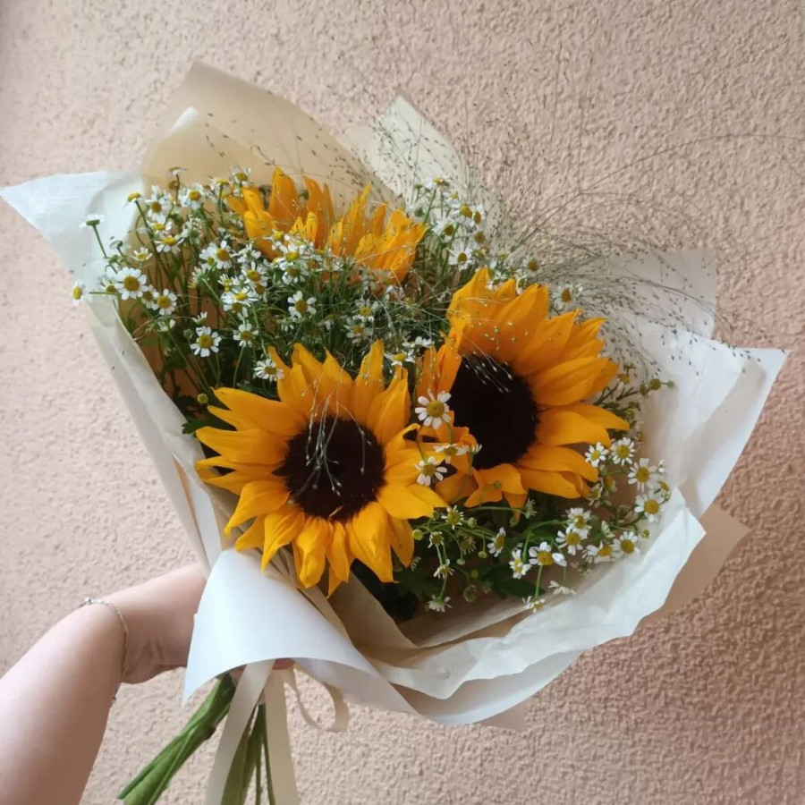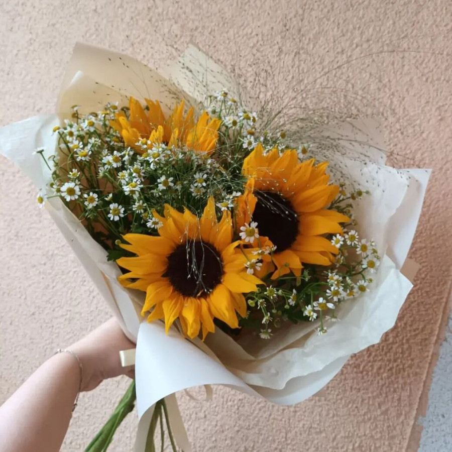 На фото букет из подсолнухов с ромашками. В составе: подсолнух 3 шт, танацетум 4 шт, . Все цветы свежие и ароматные, букет красиво оформлен и отлично подходит для подарка. Доступна доставка цветов или самовывоз.