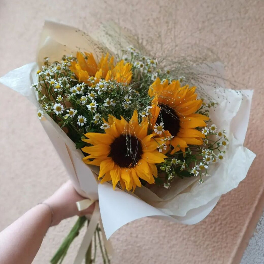 Букет из подсолнухов с ромашками