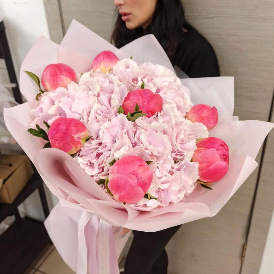 Букет из розовой гортензии и пионов