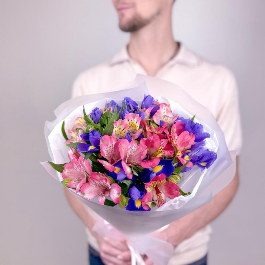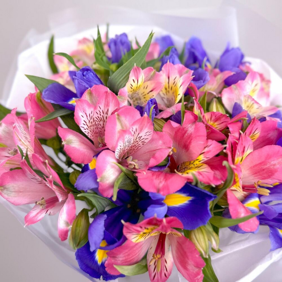 Букет из синих ирисов из розовых альстромерий в Семикаракорске