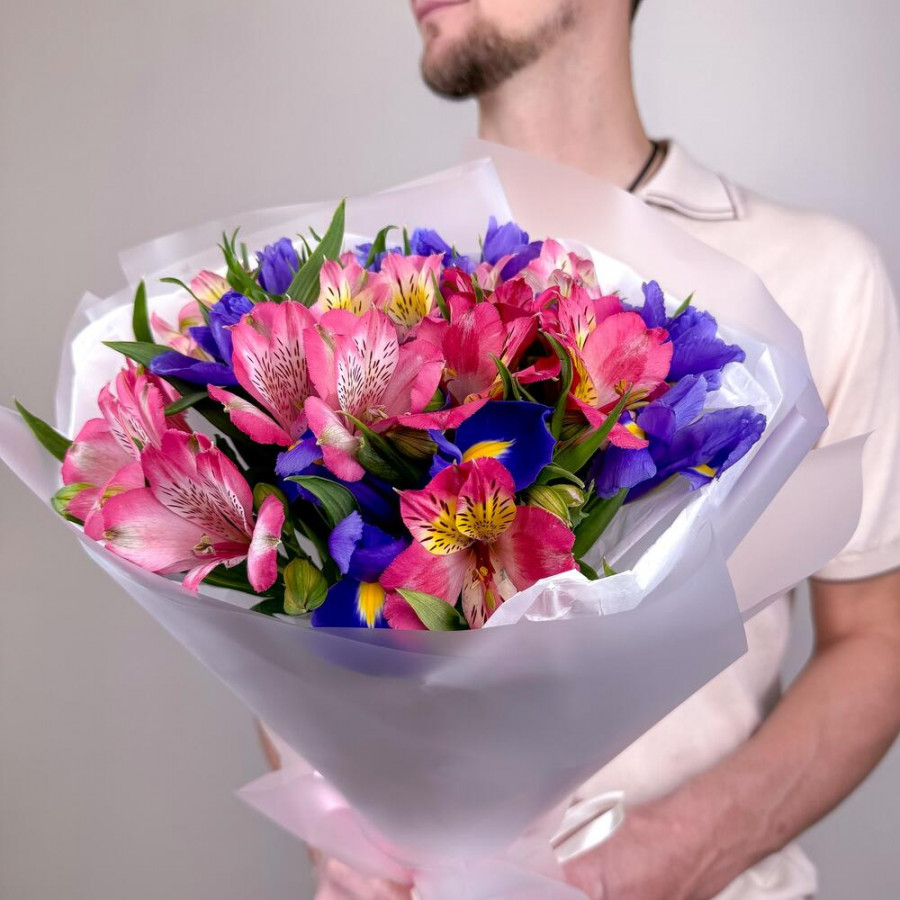 На фото букет из синих ирисов из розовых альстромерий. В составе: ирис 11 шт, альстромерия 4 шт, атласная лента 1 шт, дизайнерская упаковка 1 шт, . Все цветы свежие и ароматные, букет красиво оформлен и отлично подходит для подарка. Доступна доставка цветов или самовывоз.