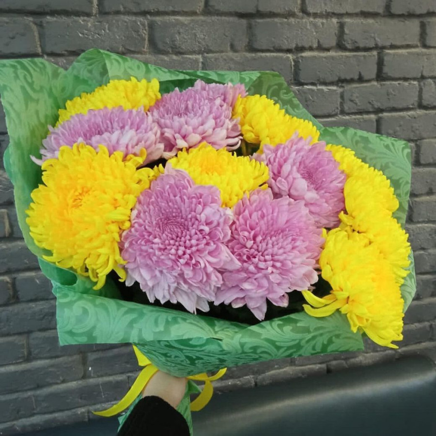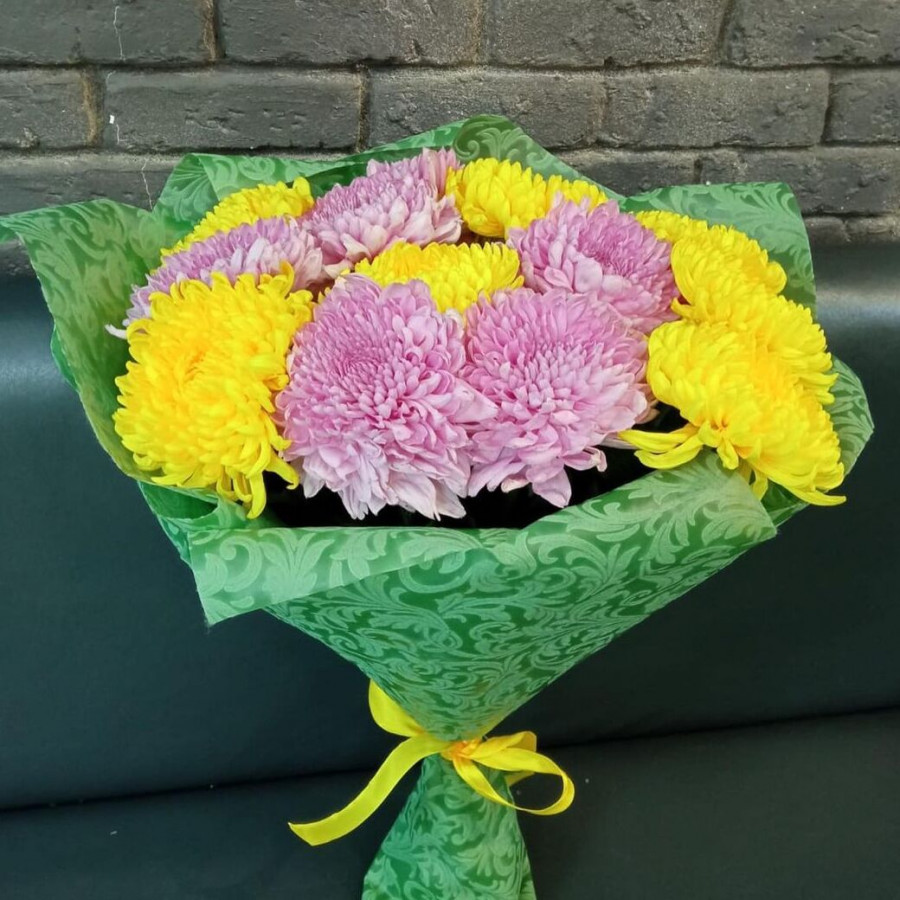 На фото букет из желто-фиолетовых хризантем. В составе: хризантема одноголовая 13 шт, фетр 1 шт, атласная лента 1 шт, . Все цветы свежие и ароматные, букет красиво оформлен и отлично подходит для подарка. Доступна доставка цветов или самовывоз.