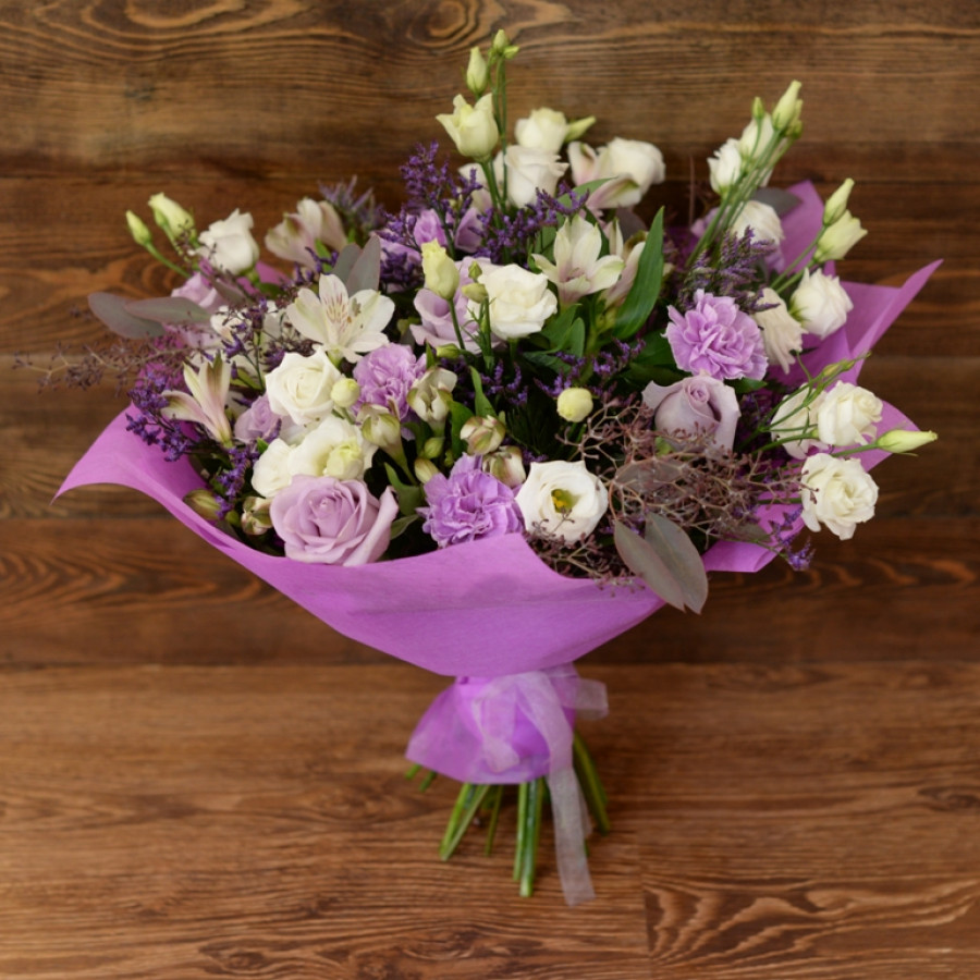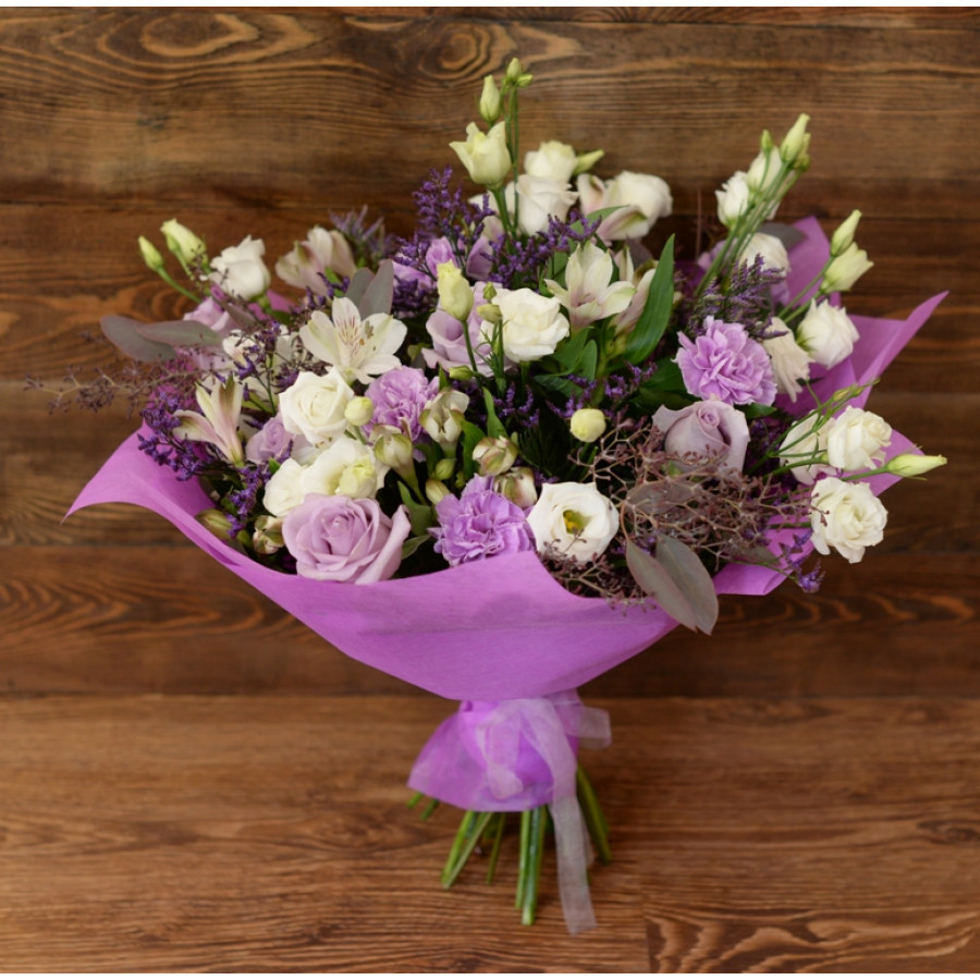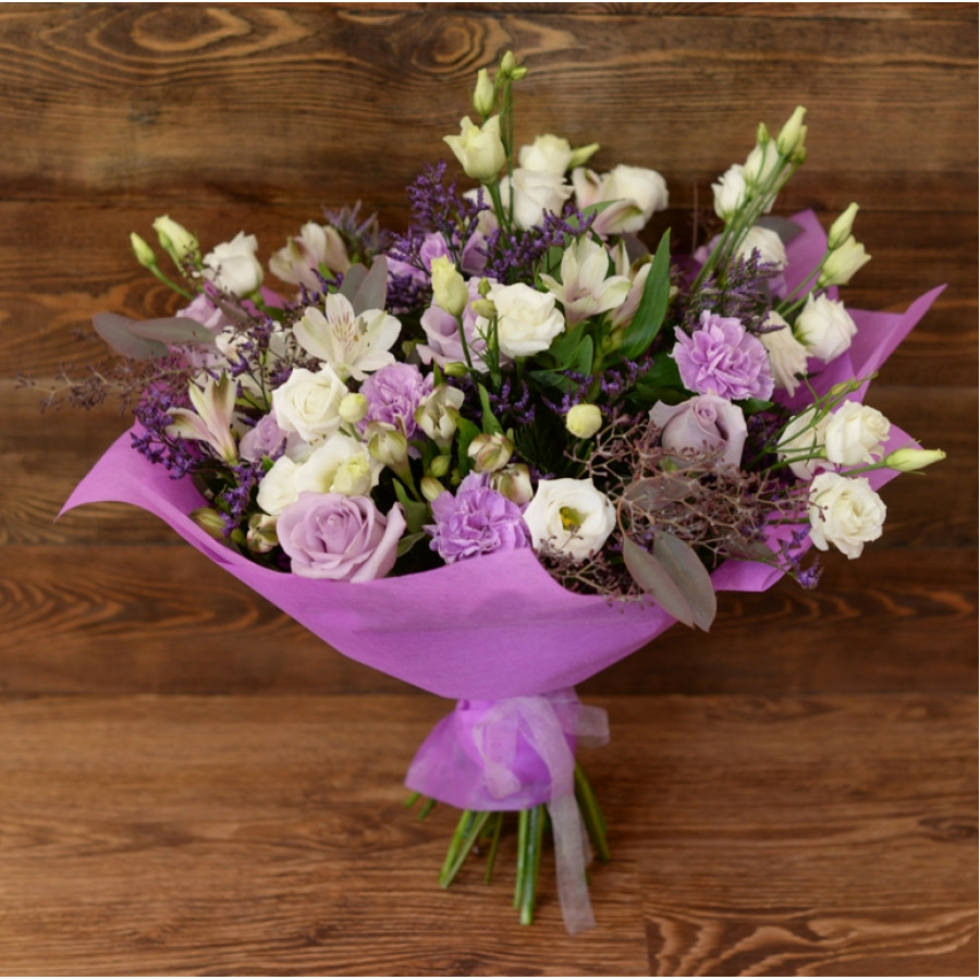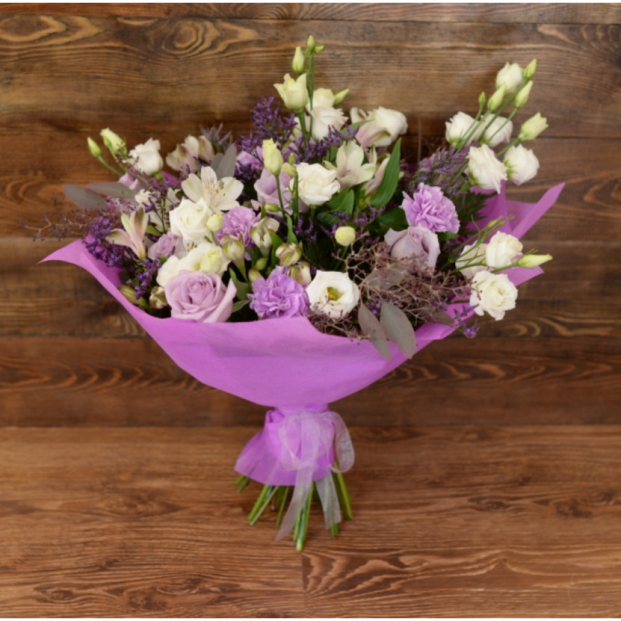 Изысканное сочетание свежесрезанных роз и гвоздик, эустом и альстромерий, задекорированных насыщенно зелеными листиками эвкалипта и папоротника,  по достоинству оценит даже самая взыскательная и утонченная натура. Вкрапления лимониума и стильная, оригинальная упаковка делают букет «Прованс» еще более элегантным и небанальным, что гарантированно придется по вкусу каждой представительнице прекрасного пола.