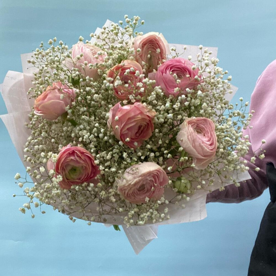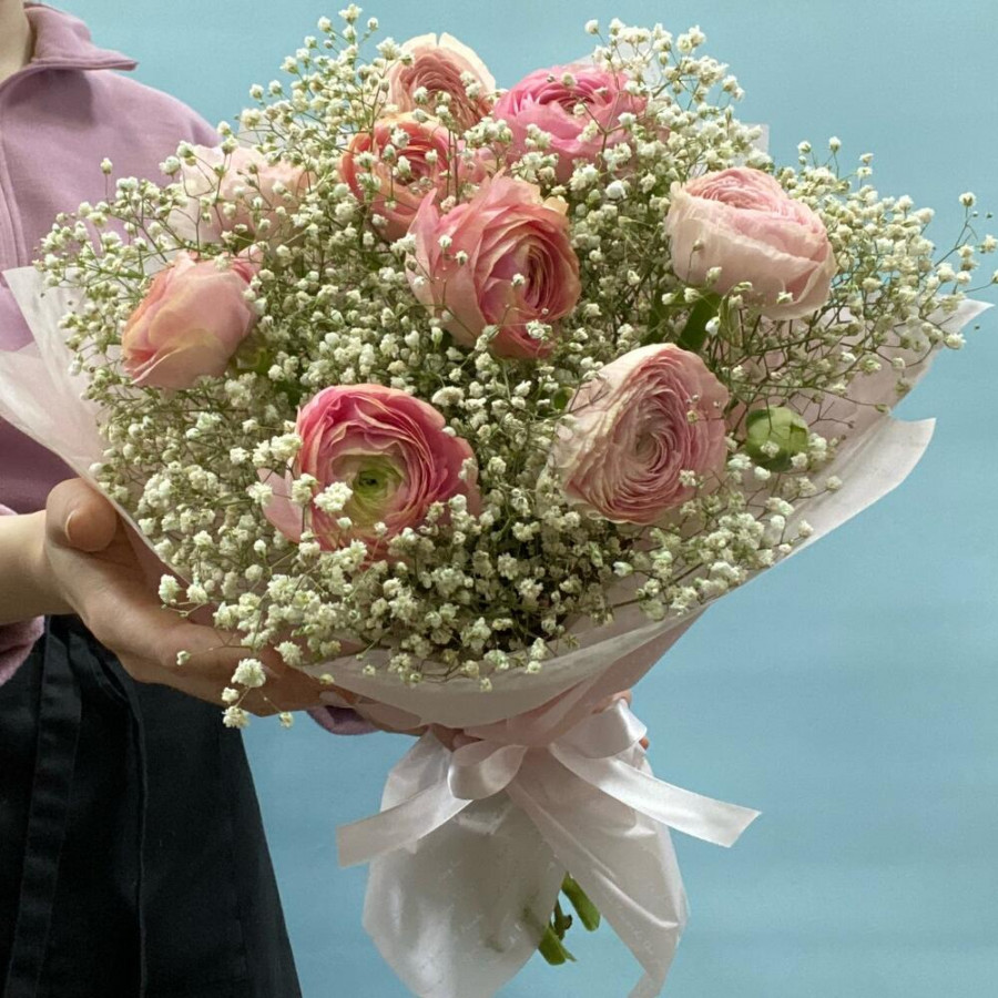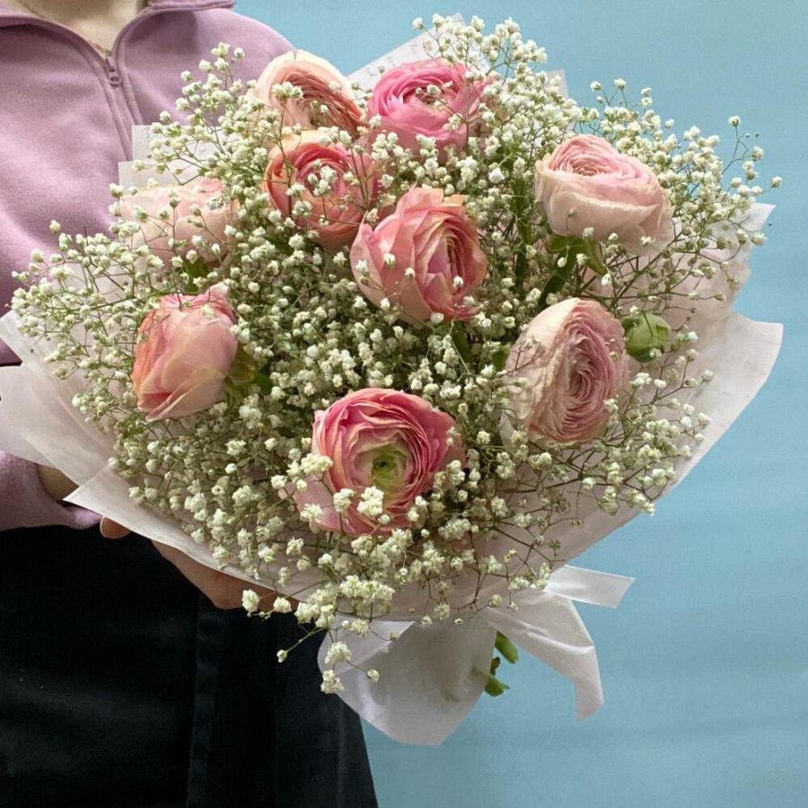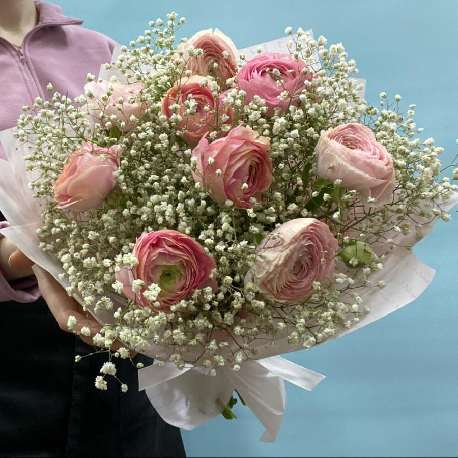 Букет из розовых ранункулюсов с белой гипсофилой в Семикаракорске