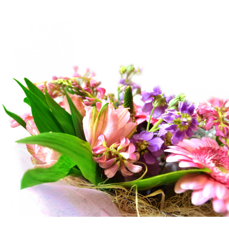 В этом букете нежные розовые герберы, альстромелии и полевая виктория, словно ранний рассвет, оттеняют пышную гортензию цвета морской волны. Сладкий, необычный аромат будет тонким шлейфом преследовать получательницу, а нежное и одновременно яркое сочетание непременно привлечет её внимание и заставит её еще долго думать о Вас, море и рассвете.