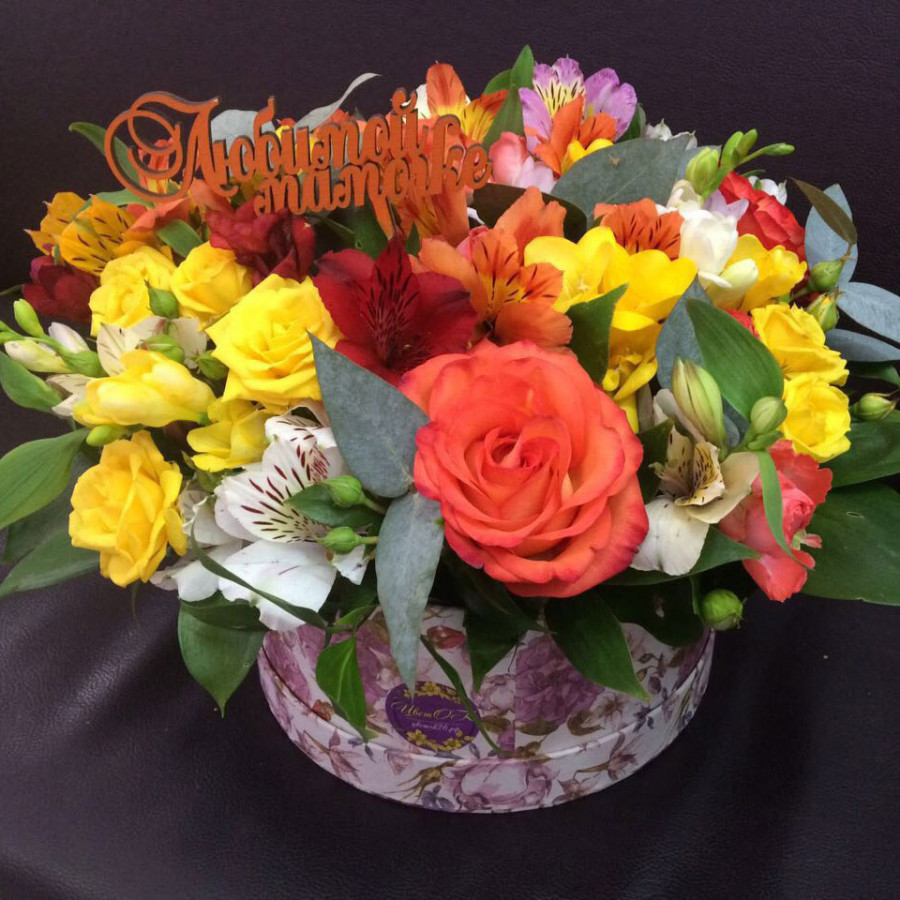 Яркие солнечные кустовые розы желтого цвета вперемешку с искристыми альстромелиями наполнили чудесную коробочку терпкими солнечными цветами и станут идеальным подарком, который сумеет привнести в жизнь получательницы яркое летнее настроение и солнечные краски безмятежности.