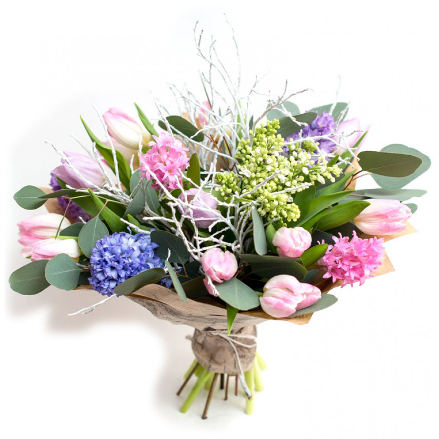 Свежайшие тюльпаны, дополненные прелестными и нежными  гиацинтами, украшенные веточкой сирени и листочками эвкалипта станут приятным напоминанием о теплых и солнечных весенних днях. Необычное декоративное оформление, стильная и оригинальная упаковка делают этот изысканный букет идеальным презентом для близких людей, коллег, сотрудников, позволяя в полной мере проявить всю Вашу любовь и уважение к ним.