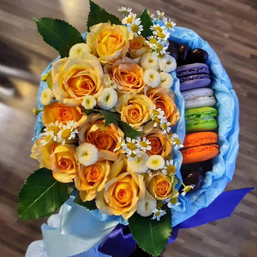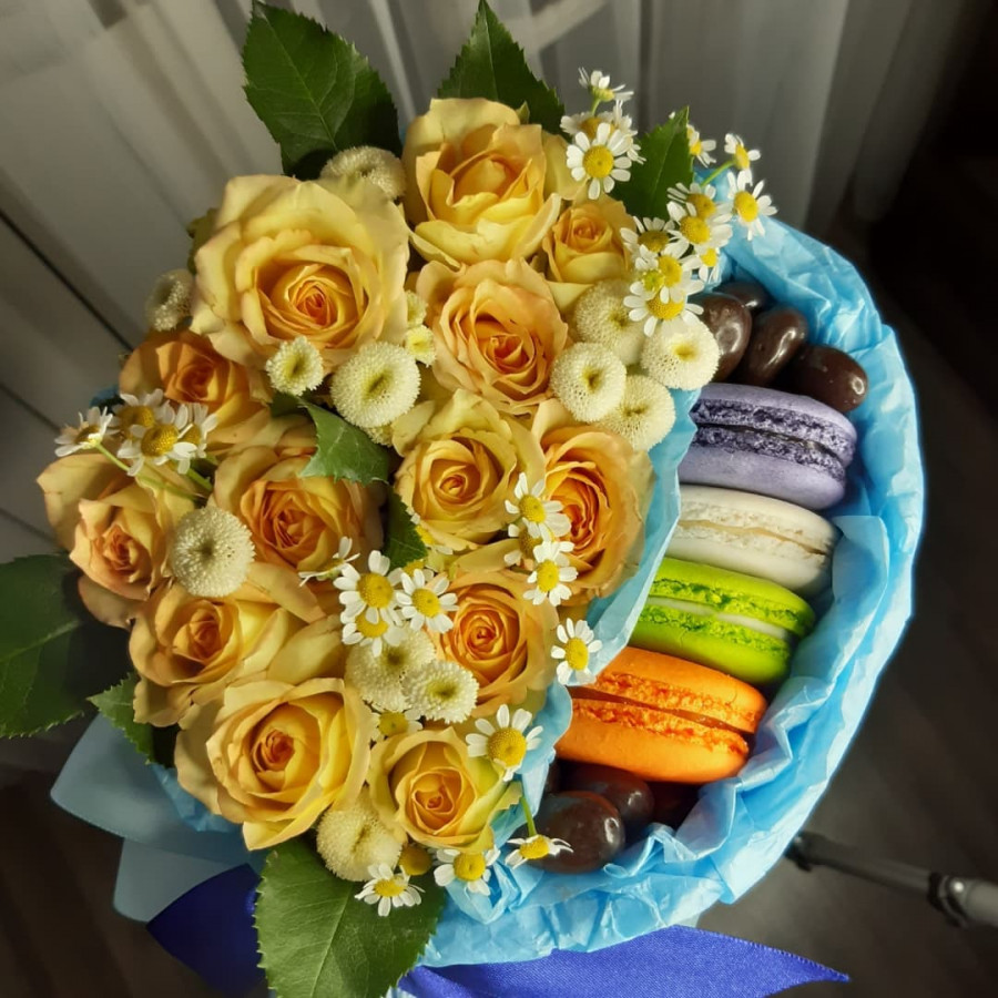 На фото цветы и макаруны в круглой коробке. В составе: макаруны 4 шт, роза 7 шт, кустовая роза 3 шт, хризантема кустовая 1 шт, коробка (s) 1 шт, . Все цветы свежие и ароматные, букет красиво оформлен и отлично подходит для подарка. Доступна доставка цветов или самовывоз.