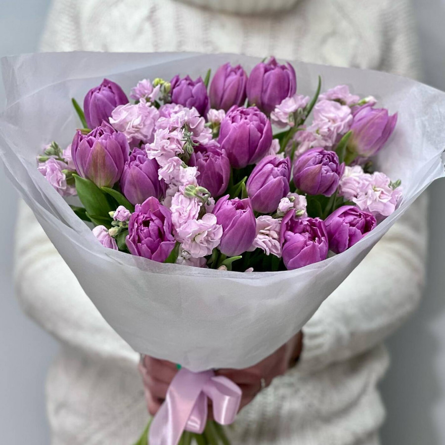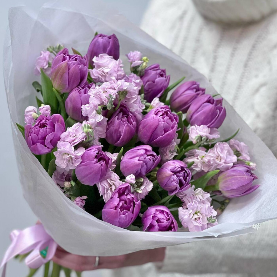Фиолетовые тюльпаны с матиоллой в Семикаракорске