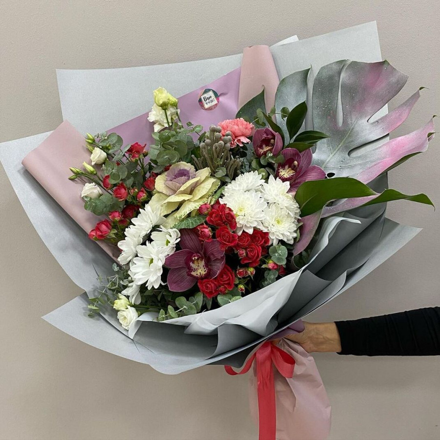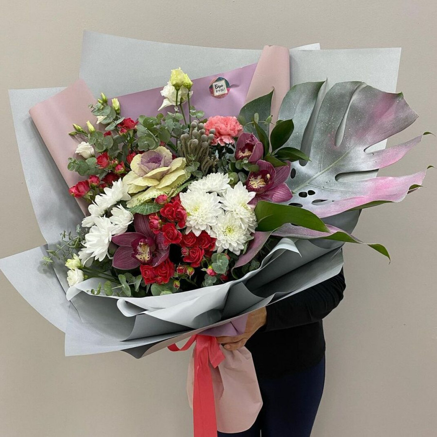На фото гигантский букет с монстерой. В составе: монстера 1 шт, капуста декоративная 1 шт, хризантема кустовая 2 шт, кустовая роза 2 шт, гвоздика 2 шт, орхидея 3 шт, эустома (лизиантус) 1 шт, роза 2 шт, бруния 1 шт, эвкалипт 2 шт, . Все цветы свежие и ароматные, букет красиво оформлен и отлично подходит для подарка. Доступна доставка цветов или самовывоз.