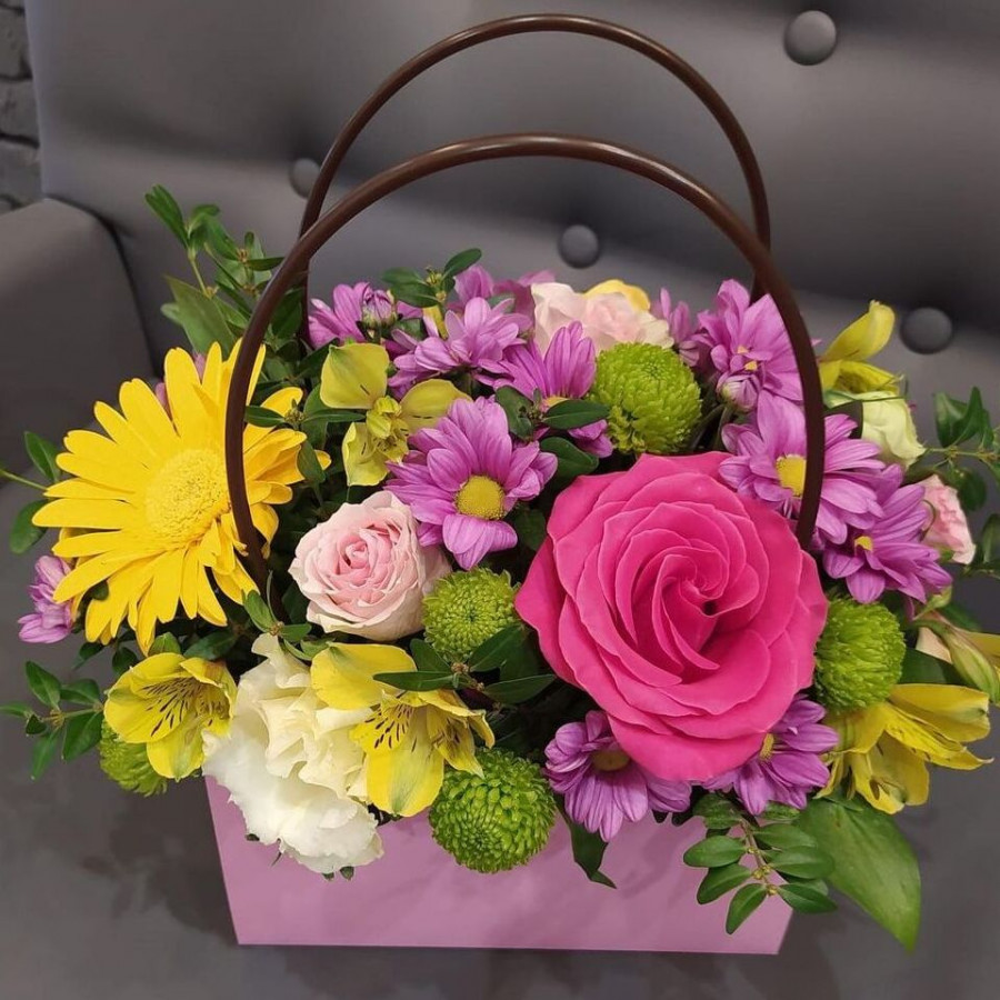 На фото композиция из роз в сумочке. В составе: роза 1 шт, роза (кения) 2 шт, кустовая роза 1 шт, хризантема кустовая 2 шт, эустома (лизиантус) 1 шт, альстромерия 1 шт, коробка (s) 1 шт, . Все цветы свежие и ароматные, букет красиво оформлен и отлично подходит для подарка. Доступна доставка цветов или самовывоз.