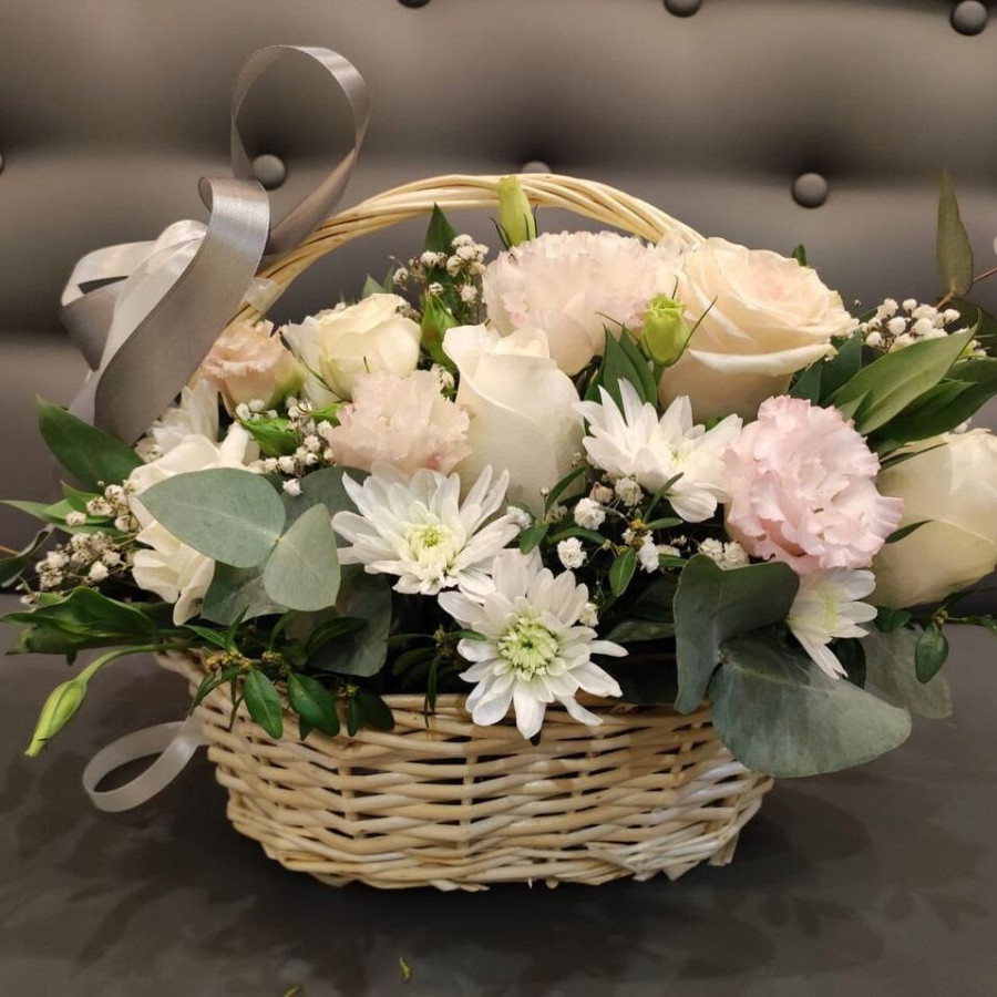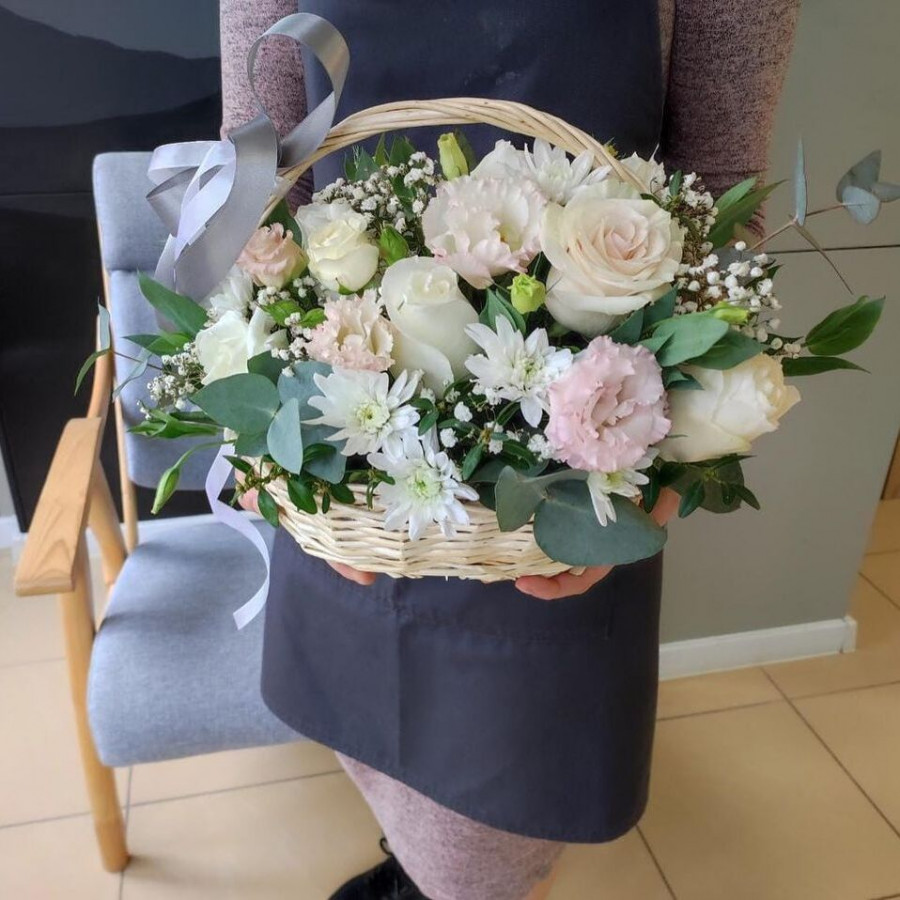 На фото корзина из белых роз и хризантем. В составе: хризантема кустовая 4 шт, роза 7 шт, кустовая роза 2 шт, эустома (лизиантус) 3 шт, гипсофила 2 шт, корзина (s) 1 шт, . Все цветы свежие и ароматные, букет красиво оформлен и отлично подходит для подарка. Доступна доставка цветов или самовывоз.