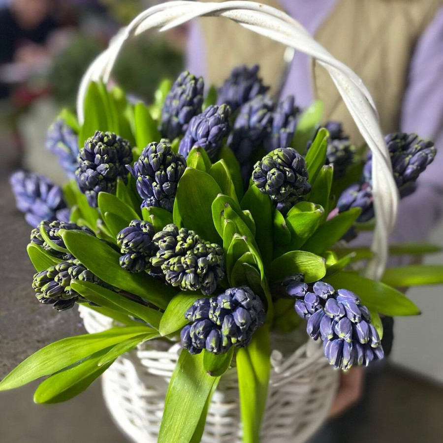 На фото корзина с голубыми гиацинтами. В составе: гиацинт 19 шт, корзина (s) 1 шт, атласная лента 1 шт, . Все цветы свежие и ароматные, букет красиво оформлен и отлично подходит для подарка. Доступна доставка цветов или самовывоз.