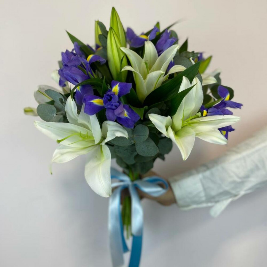 На фото букет из белых лилий с синими ирисами. В составе: лилия 5 шт, ирис 9 шт, эвкалипт 1 шт, дизайнерская упаковка 1 шт, атласная лента 1 шт, . Все цветы свежие и ароматные, букет красиво оформлен и отлично подходит для подарка. Доступна доставка цветов или самовывоз.