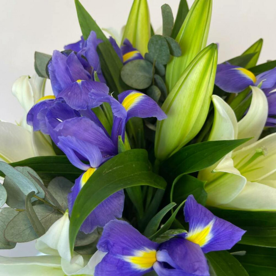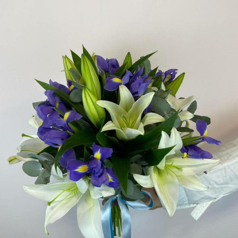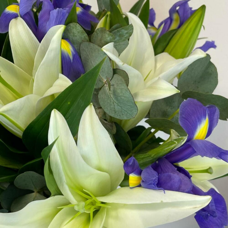 Букет из белых лилий с синими ирисами