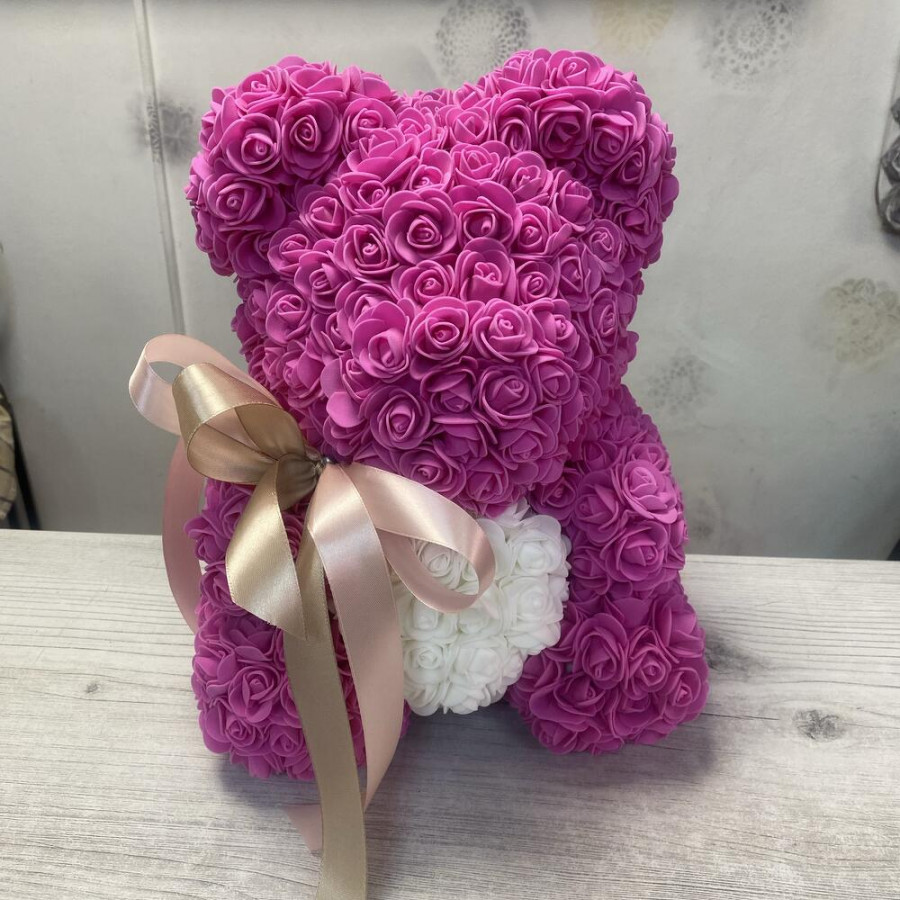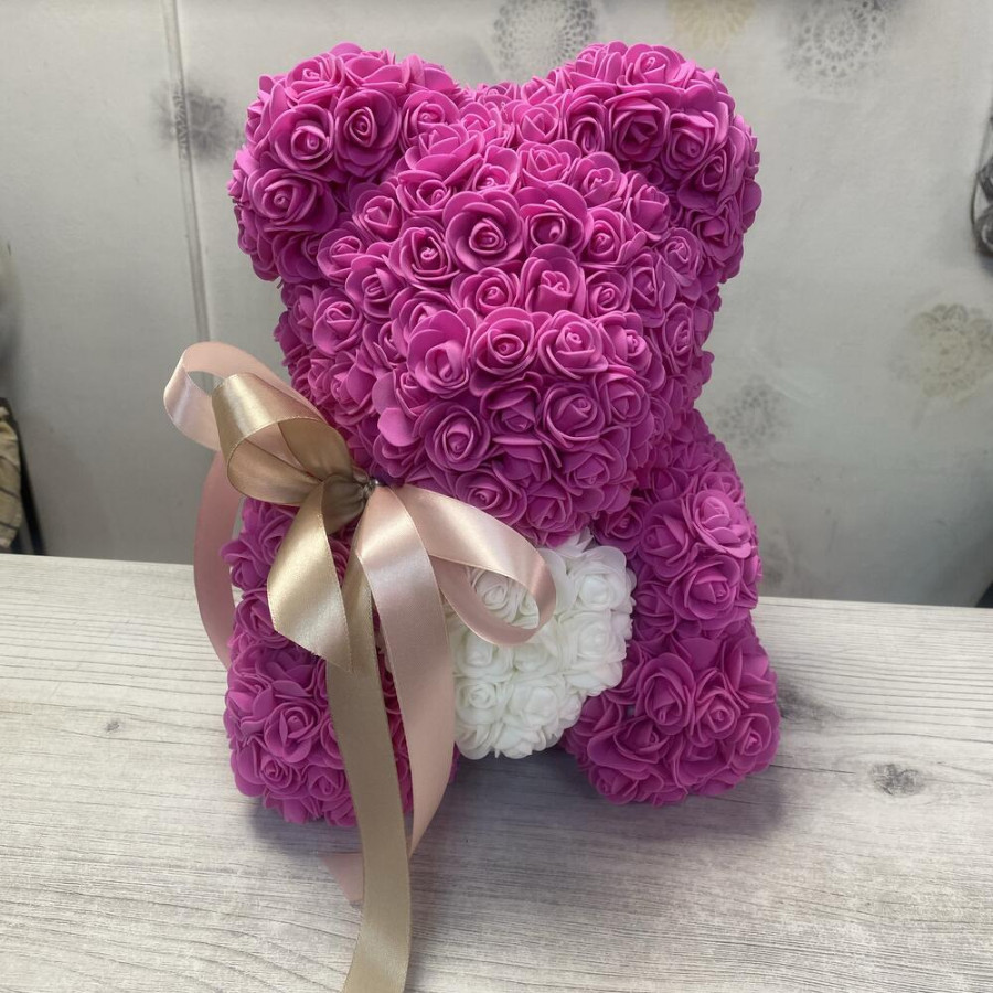 На фото мишка из роз «розовый». В составе: . Все цветы свежие и ароматные, букет красиво оформлен и отлично подходит для подарка. Доступна доставка цветов или самовывоз.