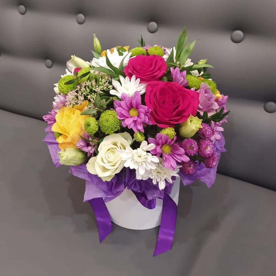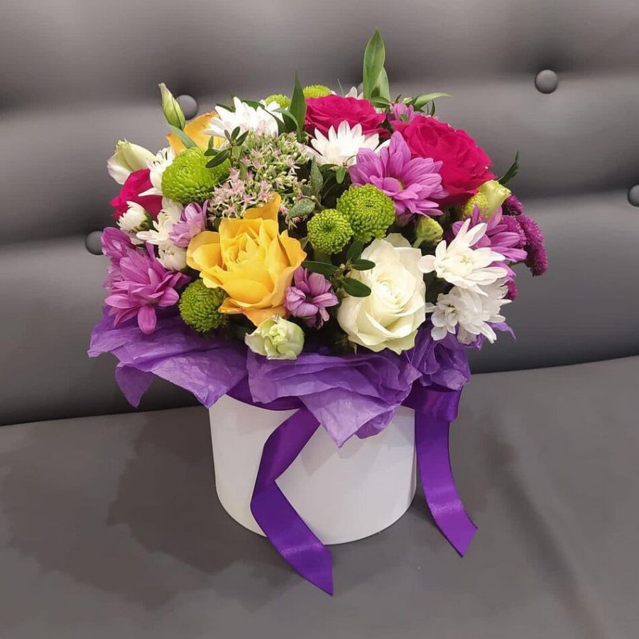 На фото небольшая композиция из цветов. В составе: хризантема кустовая 2 шт, роза (кения) 2 шт, роза 2 шт, писташ 2 шт, коробка (s) 1 шт, . Все цветы свежие и ароматные, букет красиво оформлен и отлично подходит для подарка. Доступна доставка цветов или самовывоз.