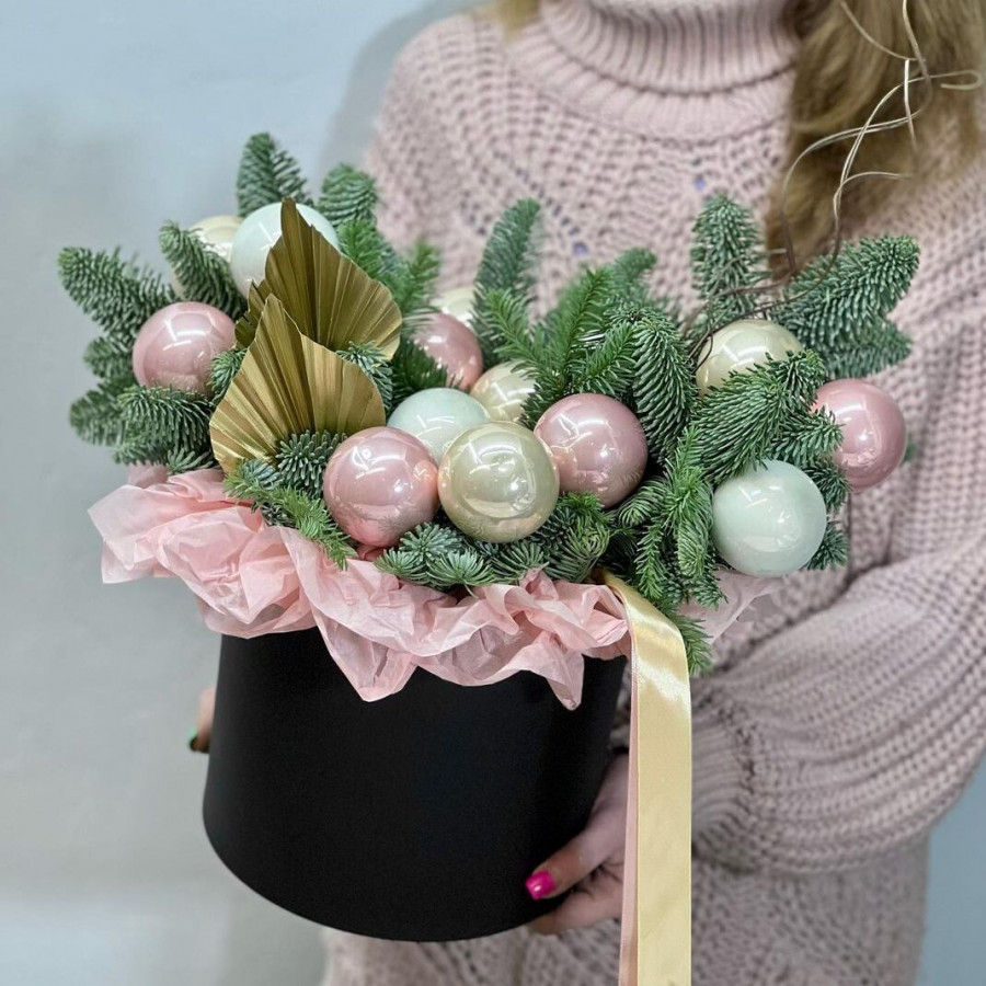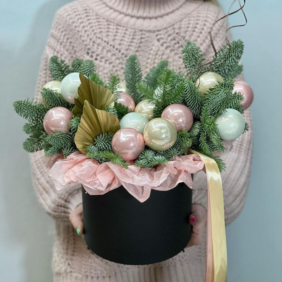 На фото новогодний букет из нобилиса и игрушек. В составе: нобилис 3 шт, елочная игрушка 12 шт, шляпная коробка (m) 1 шт, . Все цветы свежие и ароматные, букет красиво оформлен и отлично подходит для подарка. Доступна доставка цветов или самовывоз.