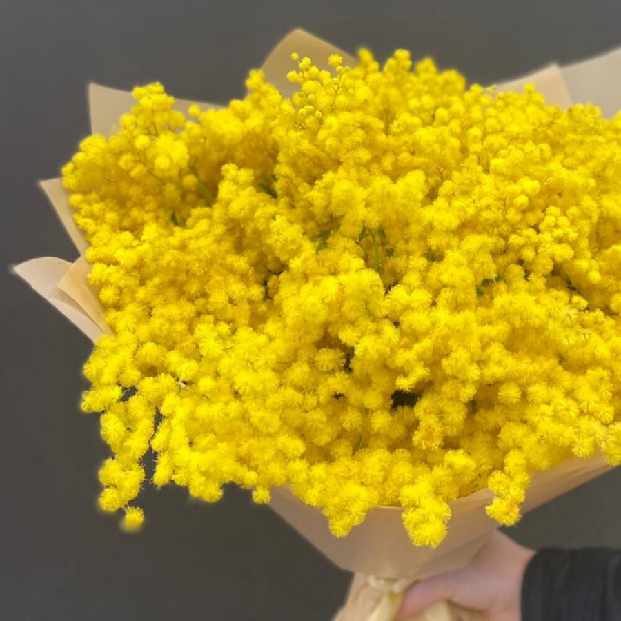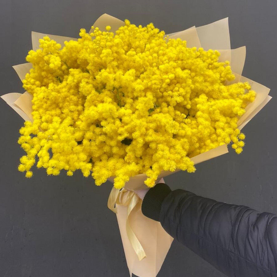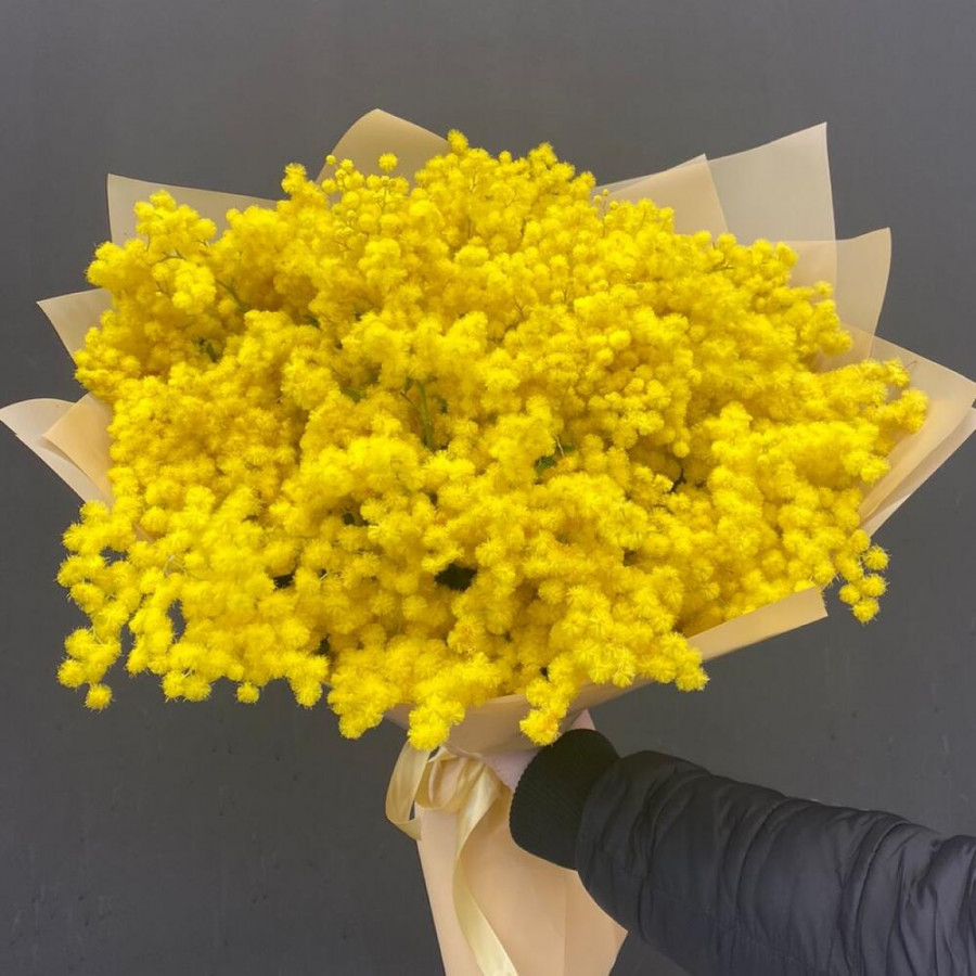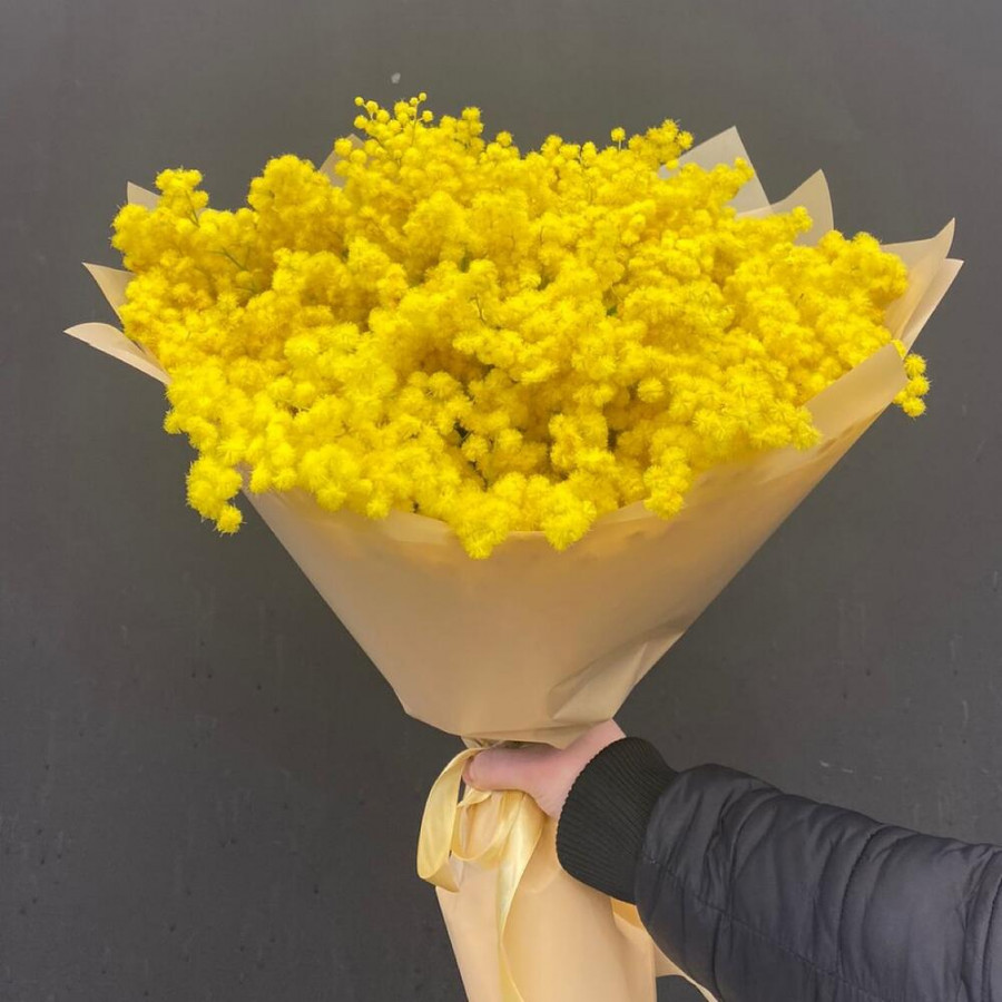 Лента атласная - 1 шт. Дизайнерская упаковка - 1 шт. мимоза итальянская пучок - 5 шт. букетная записка - 1 шт.
