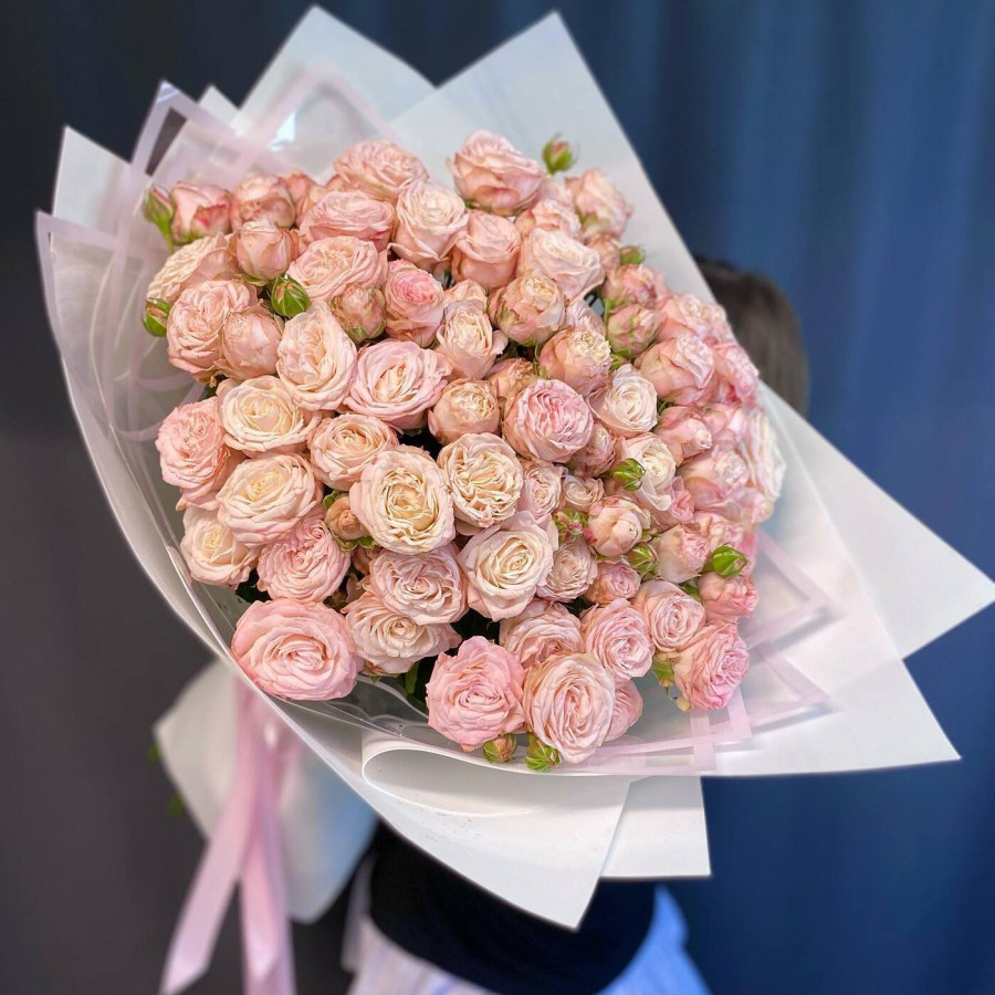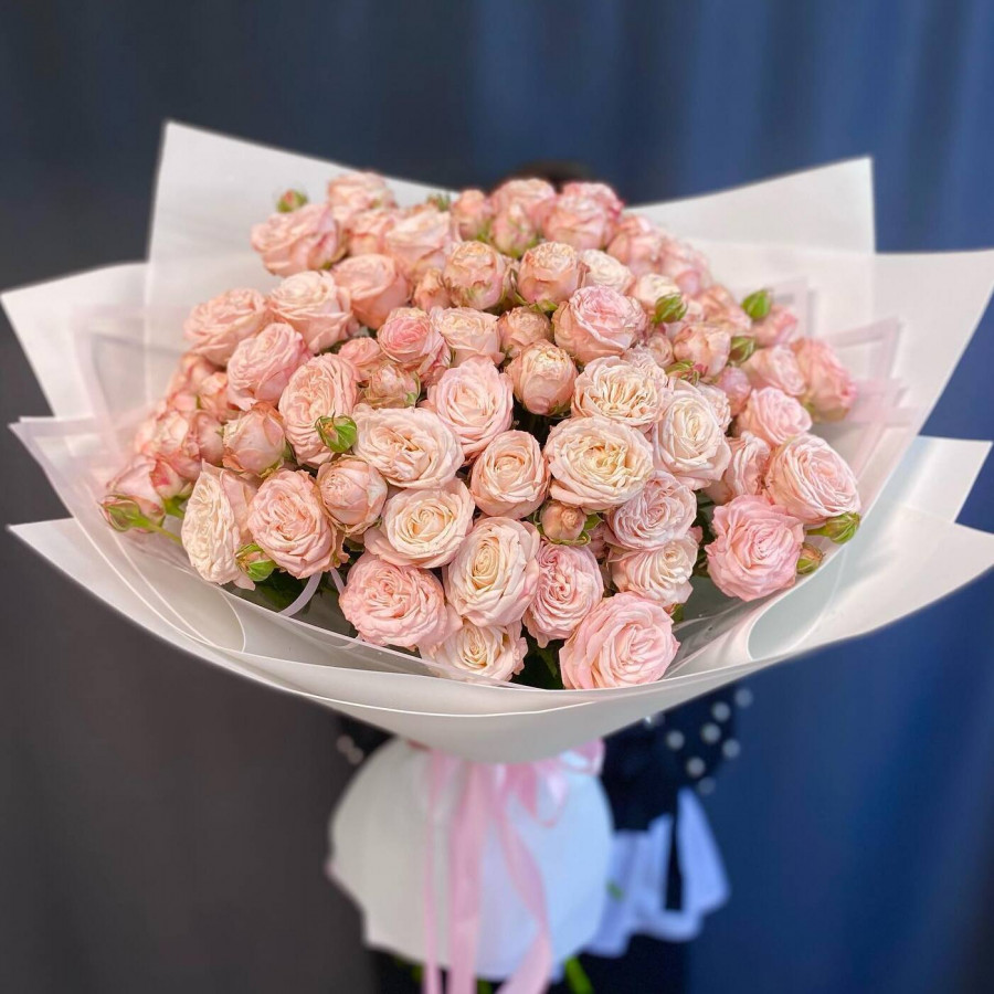 На фото пионовидные розы бомбастик. В составе: кустовая пионовидная роза 25 шт, крафт-бумага 1 шт, . Все цветы свежие и ароматные, букет красиво оформлен и отлично подходит для подарка. Доступна доставка цветов или самовывоз.