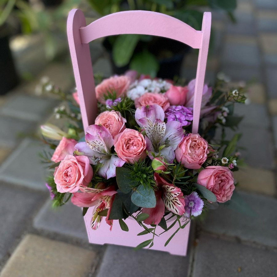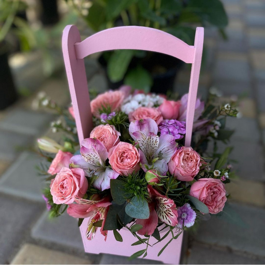 Пионовидные розы с альстромериями в деревянном ящике в Семикаракорске