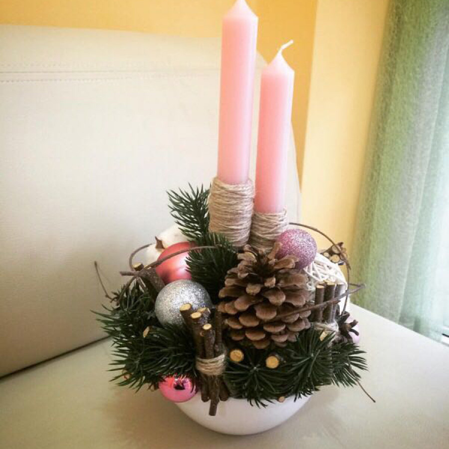 Оригинальная настольная композиция с веточками хвои и шишками ели, украшенная елочными игрушками, веточками березы, в центре которой - рождественские свечи, способные передать на расстоянии любовь и тепло Ваших чувств в замечательный праздник Рождества.