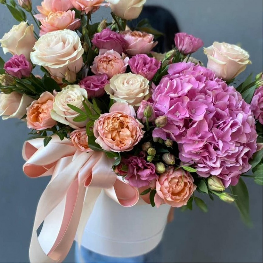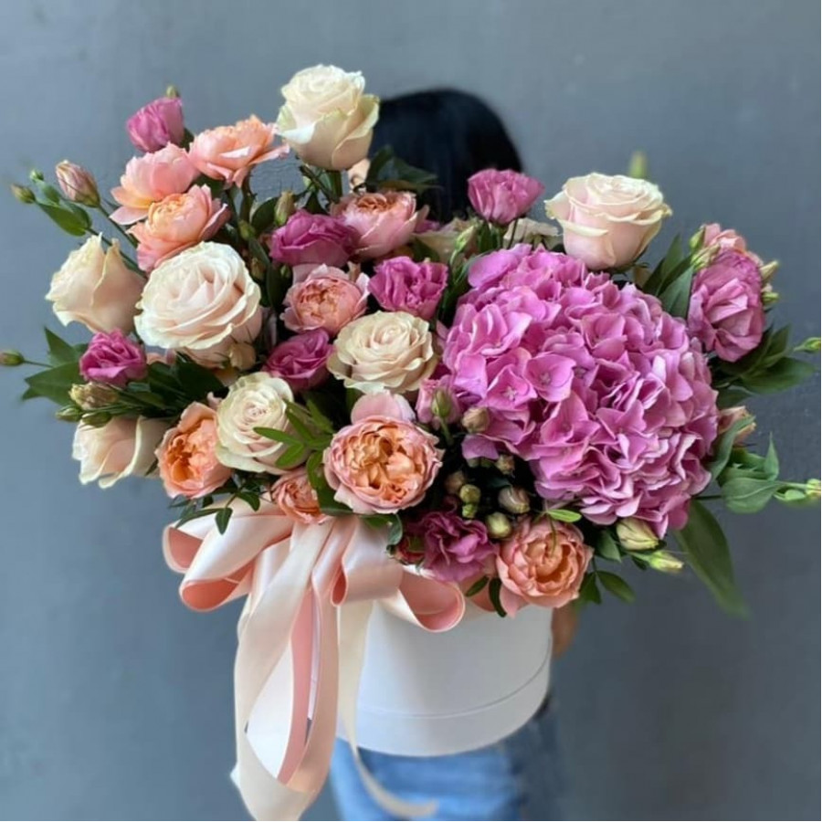 На фото розовая гортензия с розами в коробке. В составе: гортензия 1 шт, кустовая роза 4 шт, кустовая пионовидная роза 6 шт, роза 5 шт, шляпная коробка (m) 1 шт, атласная лента 1 шт, . Все цветы свежие и ароматные, букет красиво оформлен и отлично подходит для подарка. Доступна доставка цветов или самовывоз.
