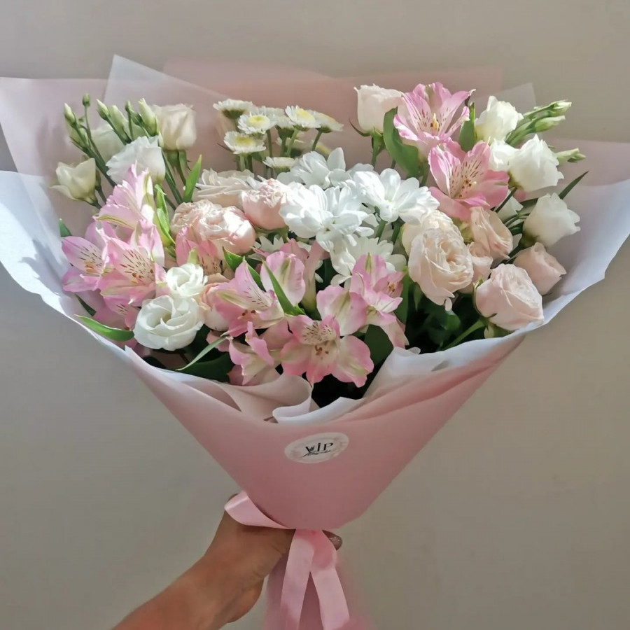 На фото свадебный букет из альстромерий и эустомы. В составе: альстромерия 5 шт, эустома (лизиантус) 4 шт, хризантема кустовая 2 шт, крафт-бумага 1 шт, атласная лента 1 шт, . Все цветы свежие и ароматные, букет красиво оформлен и отлично подходит для подарка. Доступна доставка цветов или самовывоз.