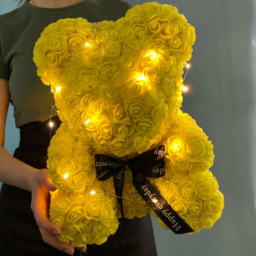 На фото желтый мишка из роз с огоньками. В составе: . Все цветы свежие и ароматные, букет красиво оформлен и отлично подходит для подарка. Доступна доставка цветов или самовывоз.