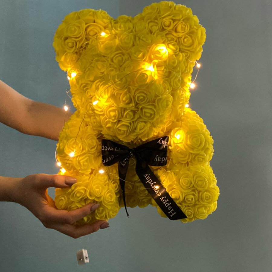 Желтый мишка из роз с огоньками
